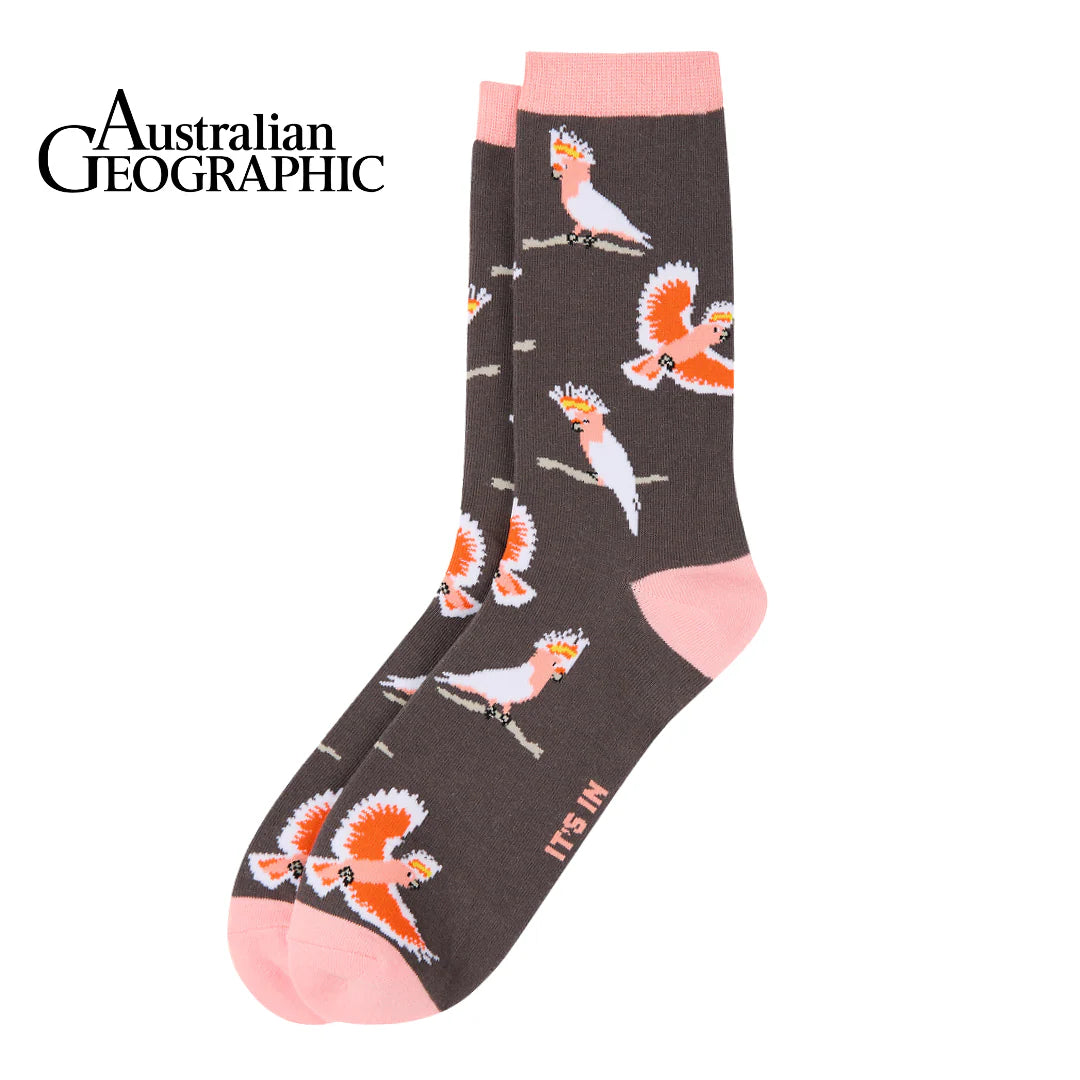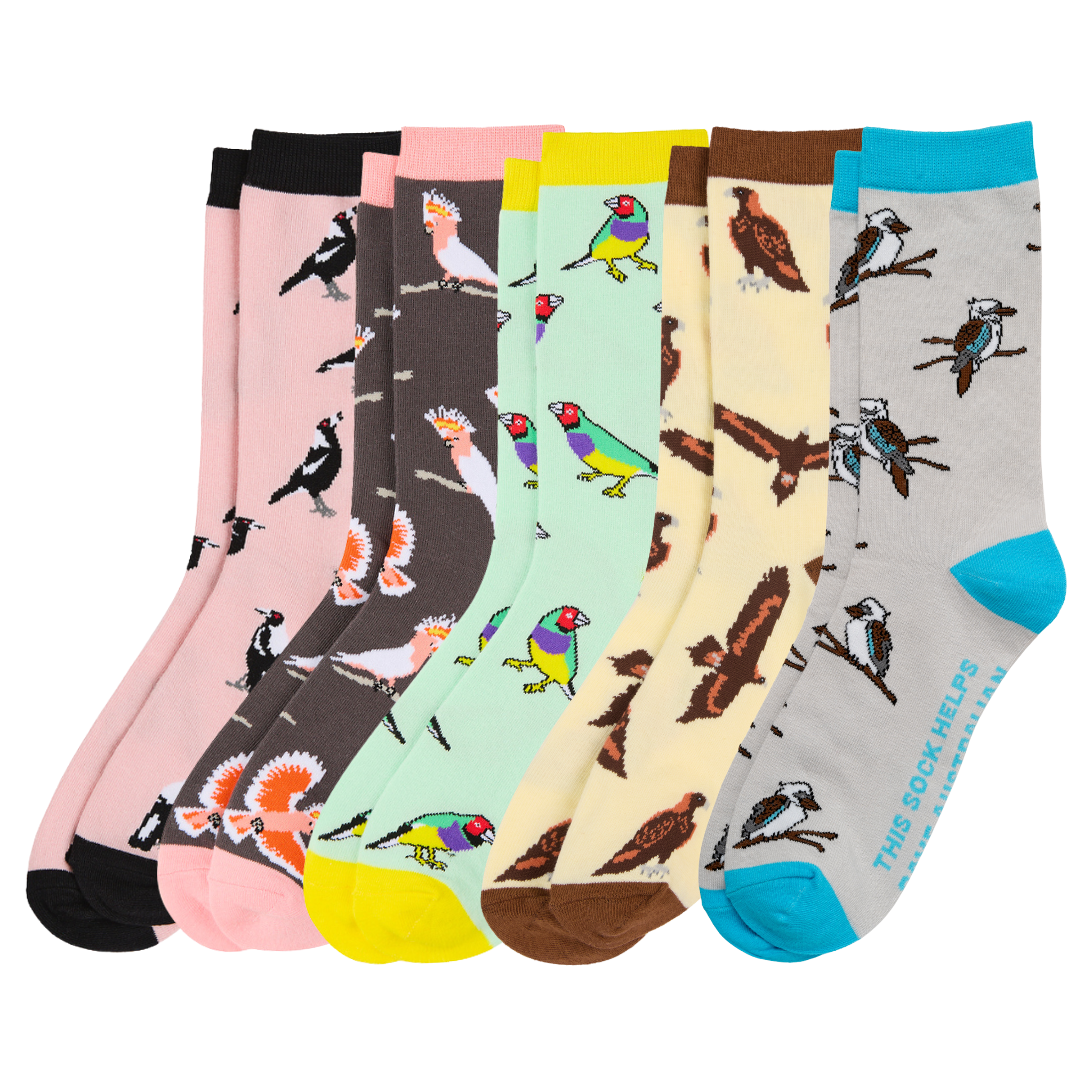 Contents: 1 x pair of Magpie Sock; 1 x pair of Kookaburra Sock; 1 x pair of Pink Cockatoo Sock; 1 x pair of Gouldian Finch Sock; 1 x pair of Wedge-Tailed Eagle Sock.