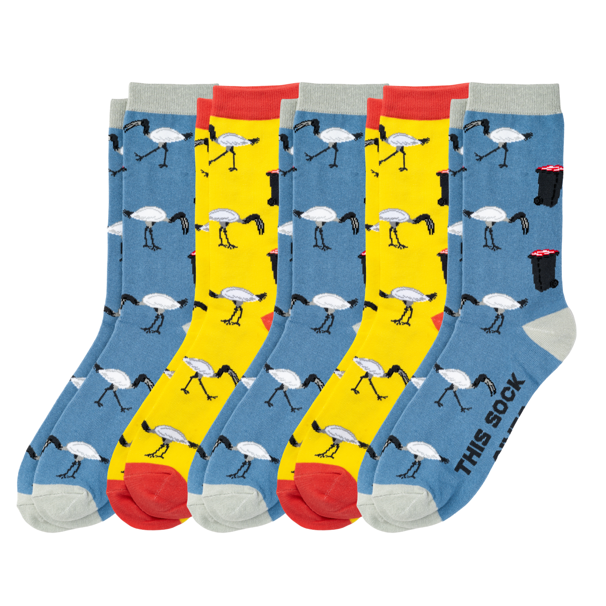 Contents: 3 x pairs of Bin Chicken Sock; 2 x pairs of Yellow Bin Chicken Sock.