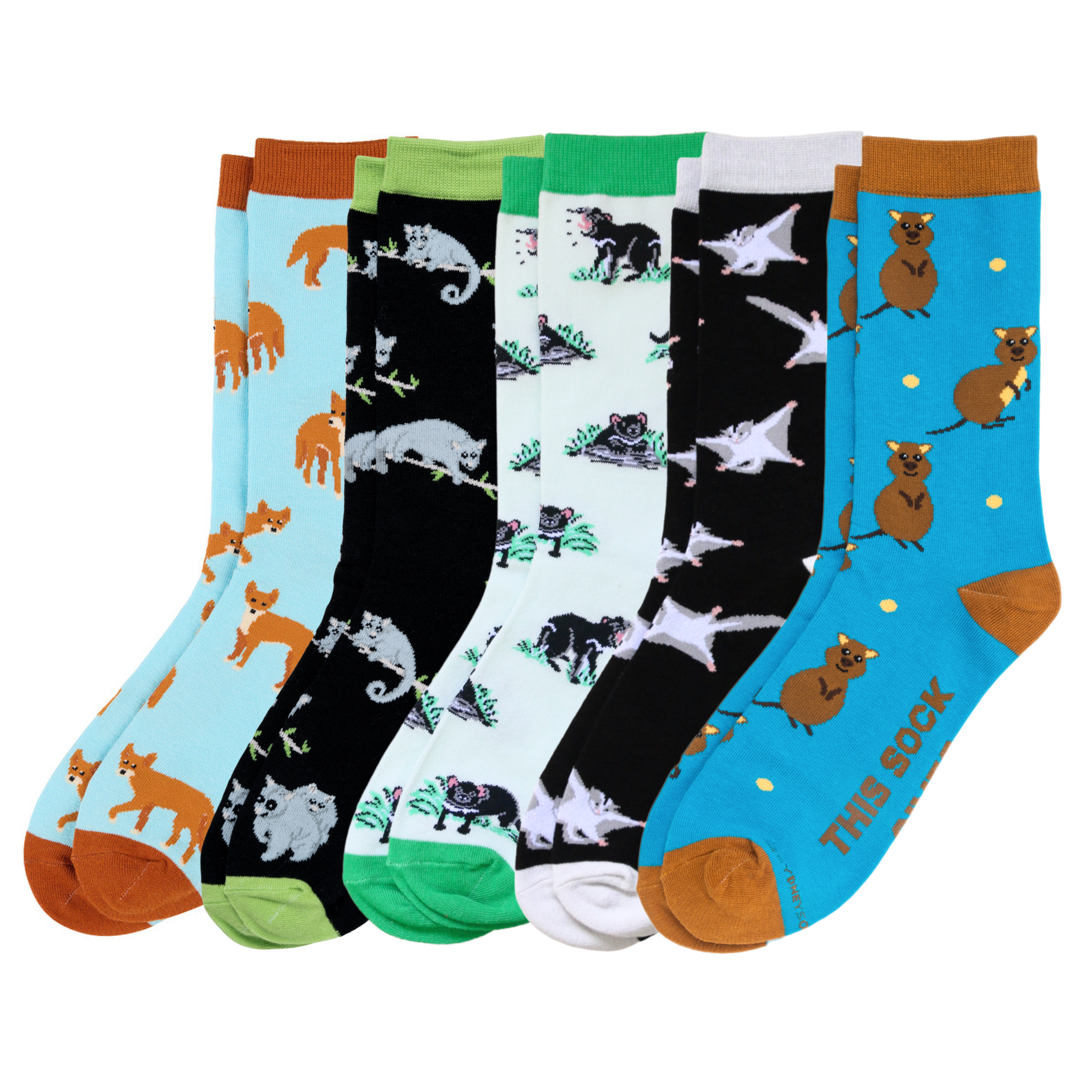 Contents: 1 x pair of Dingo Sock; 1 x pair of Possum Sock; 1 x pair of Sugar Glider Sock; 1 x pair of Tasmanian Devil Sock; 1 x pair of Quokka Sock.